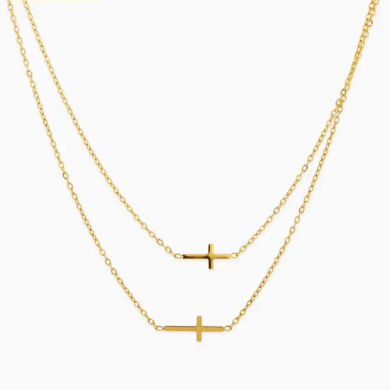Add a little sparkle and faith to your day with this dainty layered cross necklace. Two delicate chains stack together for an effortless look that feels meaningful but still totally everyday chic. Light easy and perfect for tossing on with literally anything this one is about to become your new go to piece.